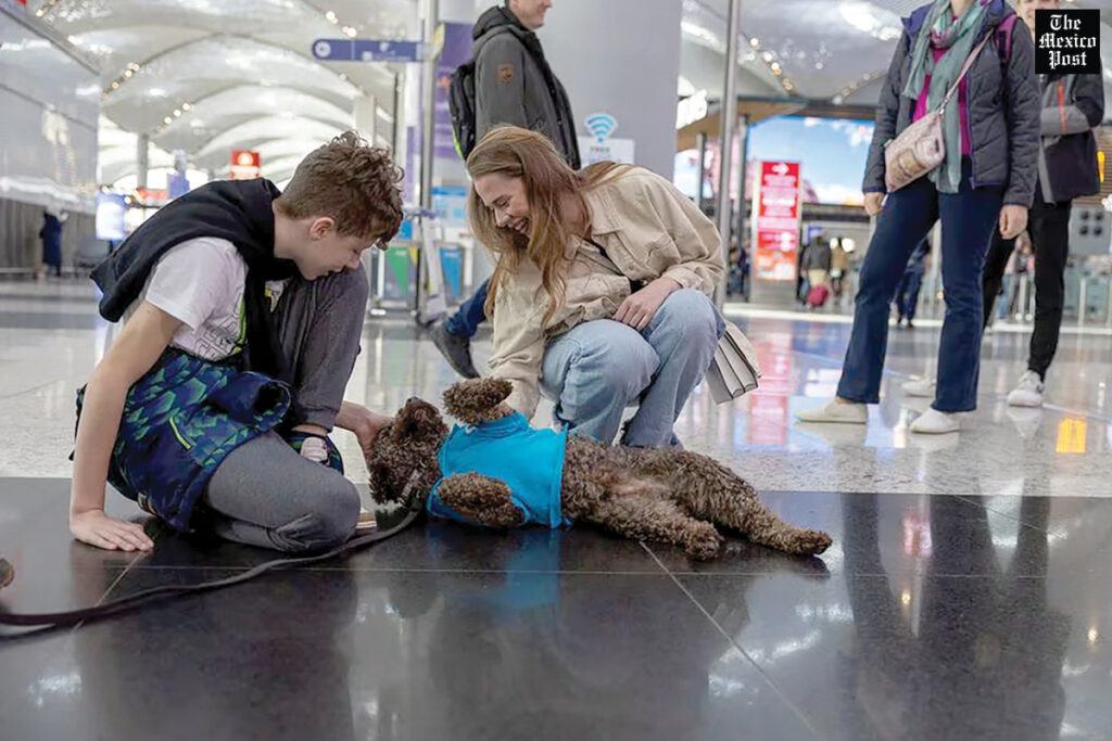 Murat Cengiz Koca, un experto en comportamiento canino y entrenador que acompaña a los caninos por el aeropuerto, dijo que los animales fueron entrenados para no reaccionar ante sonidos o personas.