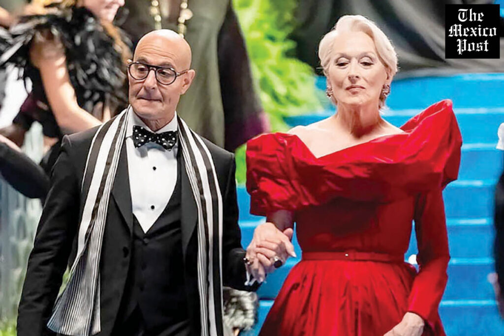 Meryl Streep luce un vestido escarlata asimétrico de tafetán, con un solo hombro descubierto y una falda amplia que recuerda a una flor en pleno despliegue, sobre una alfombra cerúlea. Su acompañante, Stanley Tucci, viste un esmoquin negro con pajarita de lunares y pañuelo rayado, irradiando una complicidad estilizada propia del mundo editorial. Este montaje temático floral no solo recuerda a un evento glamurosamente teatral, sino que podría ser clave narrativo en la trama.